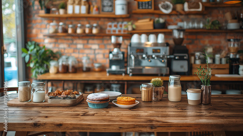 A charming vintage coffee shop with rustic wooden tables, exposed brick walls, and an assortment of pastries on display. The atmosphere is inviting and filled with nostalgic details.