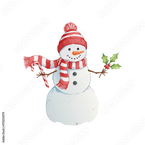A charming watercolor illustration of a snowman wearing a red striped hat and scarf, holding a candy cane and a sprig of holly