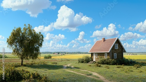 A charming wooden cottage under the bright morning sun, surrounded by open fields and a vast blue sky.