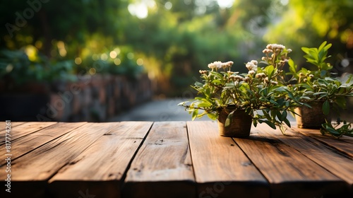 A charming wooden table set amidst a picturesque countryside scene, offering a perfect spot for text or product display