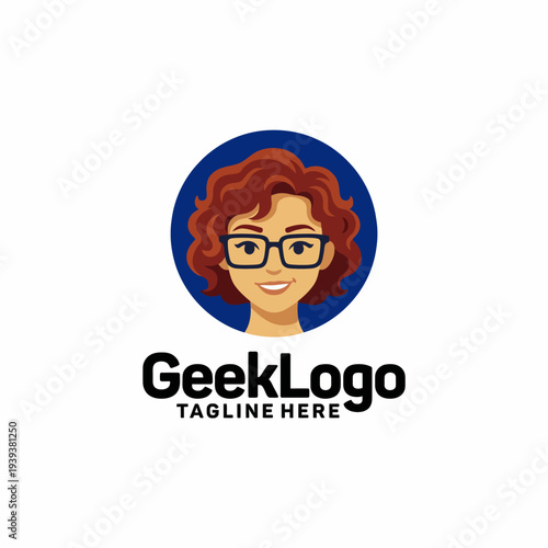 A cheerful and modern logo featuring a young woman with curly hair and glasses, representing intelligence, friendliness, and engagement for tech-related services.