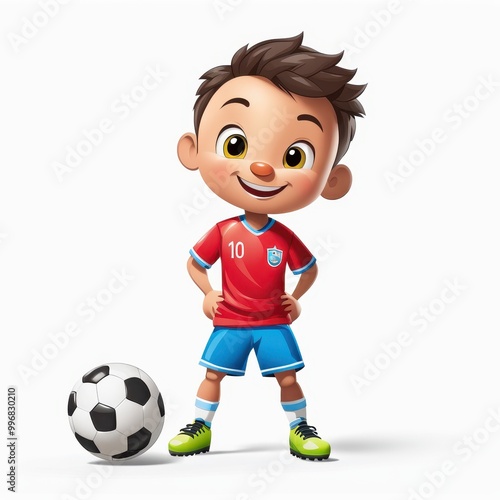 A cheerful cartoon boy in a soccer uniform poses with a ball, promoting sports and activity.
