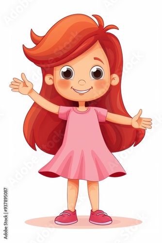 A cheerful cartoon girl with bright red hair waves joyfully, wearing a cute pink dress, spreading happiness around her.