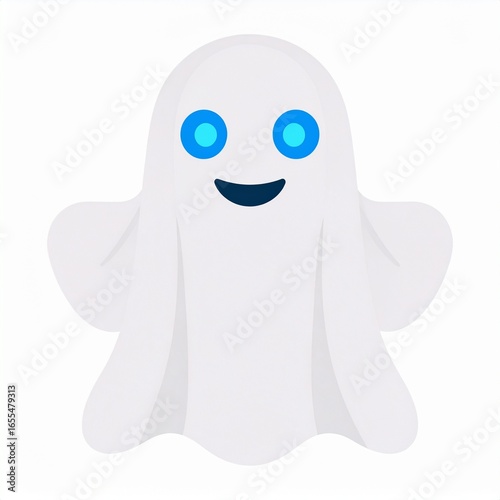 A cheerful, cartoonish ghost is depicted against a plain background, showcasing simple shapes and bright colors.