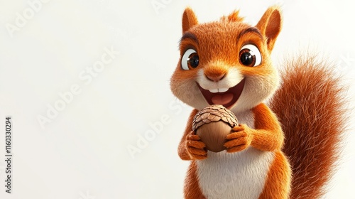 A cheerful, cartoonish squirrel holding an acorn, showcasing bright colors and a friendly expression, perfect for children's media.