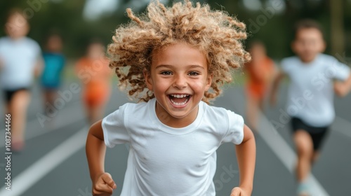 children, joyful, running, track, white, curly, hair, vitality, youthful, gleeful, sunny, youth, happy, fun, lively, excitement, freedom, playful, action, expression, dynamic, vibrant, bright, exuberance, sport, activity, motion, energy, carefree, modern, footwear, children, smile, energetic, contemporary, sunny, enthusiasm