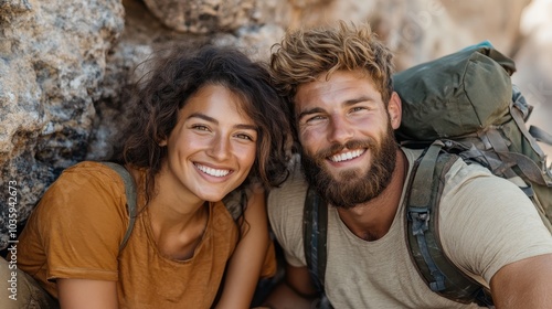 A cheerful couple, embracing the beauty of wilderness at sunset, depicting love, happiness, and exploration, set against a warm and inviting landscape.