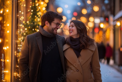 A cheerful couple laughing together while walking down a city street decorated with warm festive lights, creating a cozy winter evening atmosphere