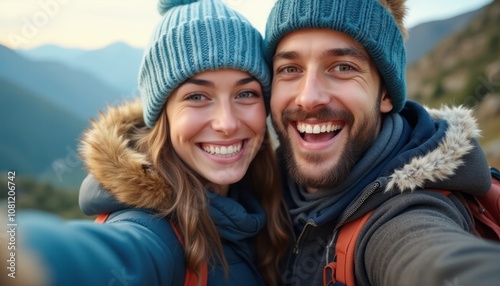 A cheerful couple poses for a selfie, their radiant smiles reflecting the joy of their outdoor adventure in the majestic mountains. Clad in cozy winter hats and jackets, they exude warmth and