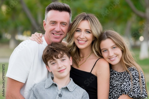 A cheerful family of four poses together in a sunny park, showcasing love and connection. Ideal for family-related themes and lifestyle imagery.