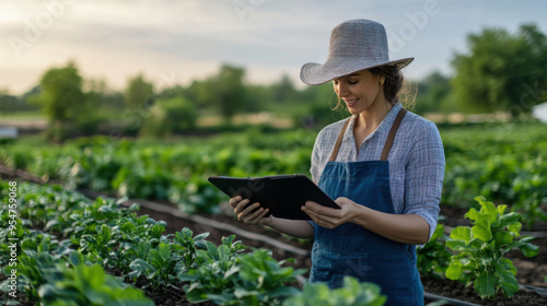 A cheerful farmer in a vegetable field using a tablet to monitor crops, representing the integration of technology in agriculture.