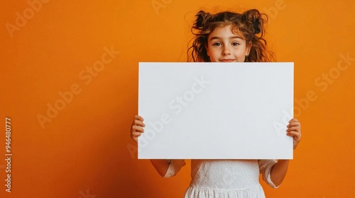 A cheerful girl with curly hair holds a blank sign against a vibrant orange backdrop, perfect for creative projects or marketing use.