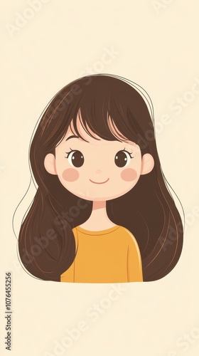 A cheerful girl with long brown hair and a warm smile, wearing a yellow sweater, illustrated in a cute, playful style.