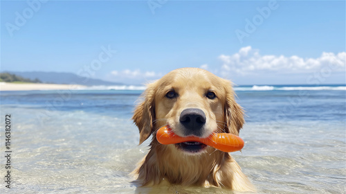 A cheerful golden retriever enjoying the beach with a toy in its mouth, standing in shallow water under a bright blue sky. Fun and sunny day vibes.