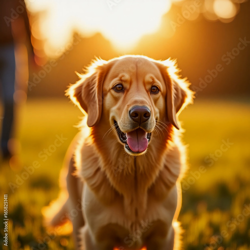 A cheerful golden retriever playfully walks through a vibrant green park as the sun sets in the background, casting a warm golden light, creating a serene atmosphere and joyful moment Generative AI