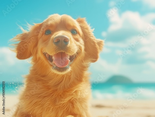 A cheerful golden retriever running on a sunny beach with ocean in the background.