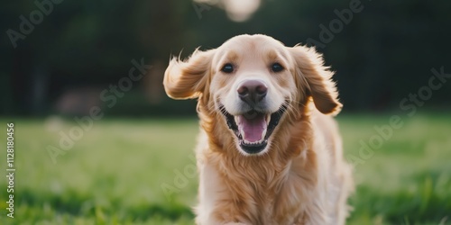 A cheerful golden retriever runs freely in a lush green field, embodying happiness and playful energy, inviting love for pets and the beauty of nature.