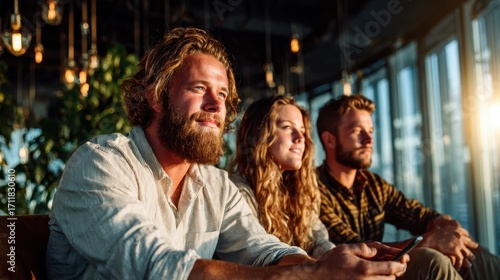 A cheerful group of friends sits together in a cozy cafe, sharing smiles and laughter while enjoying a moment of connection and camaraderie during the golden hour.