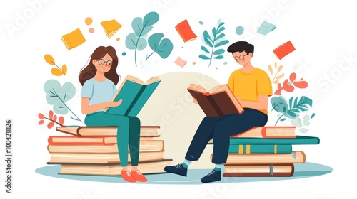 A cheerful illustration of a Caucasian boy and girl reading books on stacks, surrounded by colorful leaves and floating book icons.