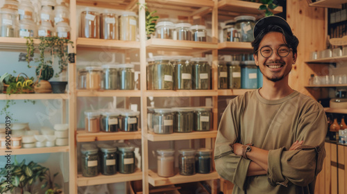 A cheerful individual stands confidently in a tidy apothecary shop filled with neatly labeled glass jars and wooden shelves, exuding warmth and hospitality.