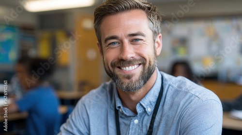 A cheerful male teacher smiles at the camera in a vibrant classroom setting, surrounded by engaged students. Ideal for educational themes.
