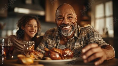 smiling, man, family, meal, kitchen, cosy, plaid, shirt, wooden, table, hearty, joy, warmth, laughter, happiness, bonding, togetherness, affectionate, candid, genuine, heartwarming, vibrant, lifestyle, moment, connection, food, enjoyment, culinary, comfort, dinner, emotion, closeup, natural, realism, gold, hours, photo, modern, home, ambient, lighting, mealtime, delight
