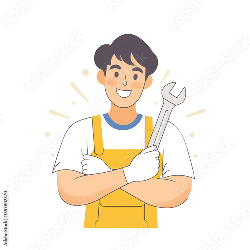 A cheerful mechanic wearing a yellow overall and gloves, confidently holding a wrench. The illustration radiates positivity and professionalism in a DIY or repair setting.