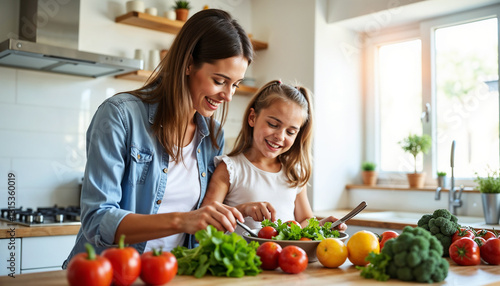 A cheerful mother and her young daughter collaborating in the kitchen to prepare a healthy meal using fresh vegetables. The scene emphasizes family bonding, healthy living, and joyful cooking