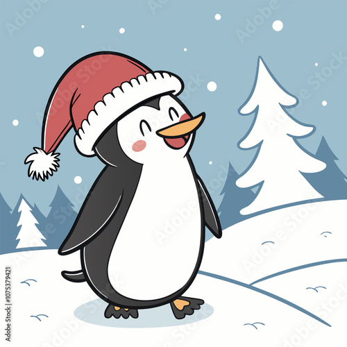 A cheerful penguin wearing a Santa hat, standing in a snowy landscape. This cute illustration is perfect for holiday cards, winter-themed designs, and adding a touch of festive fun to your projects.