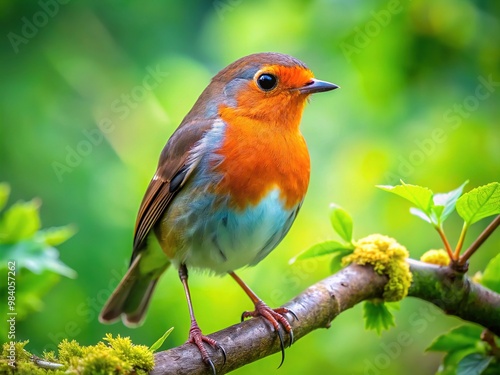 A cheerful robin perched on a tree branch against a lush green backdrop, its bright red plumage vibrant beneath the warm sunlight's gentle rays.