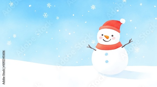 A cheerful snowman wearing a red hat and scarf smiles against a snowy background with light blue skies and falling snowflakes.