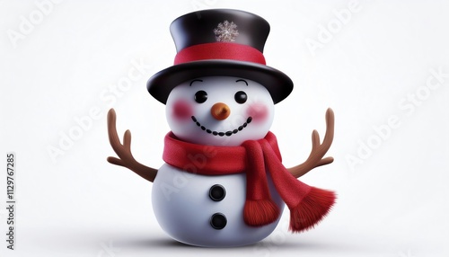 A cheerful snowman with a black hat, red scarf, and antlers, perfect for representing winter festivities and holiday spirit.