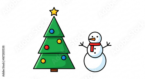 christmas, tree, snowman, winter, holiday, season, celebration, festive, decoration, ornament, star, snow, cold, wintery, seasonal, merry, joyful, happy, nature, traditional, greeting, card, illustration, drawing, cartoon, cute, whimsical, fun, playful, design, element, graphic, art, isolated, white background, white isolated