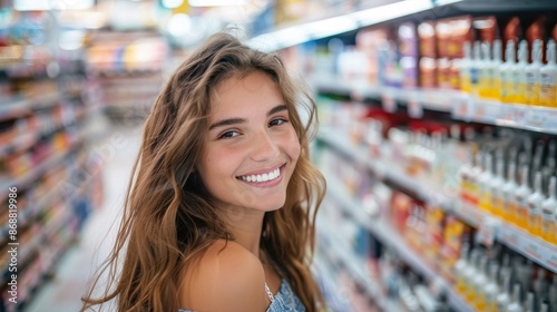 woman, smiling, grocery, store, aisle, colourful, shelf, product, radiant, cheerful, shopping, stock, happy, long hair, casual attire, retail, young, consumer, lifestyle, business, market, client, satisfaction, beauty, variety, 21st century, modern, enjoyment, facial expression, fashion, carefree, fresh produce, female, white teeth, item, supermarket