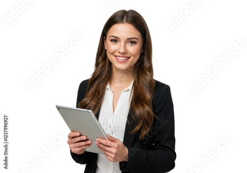 A cheerful woman with long brown hair, wearing a black blazer over a white blouse, holding a tablet and standing