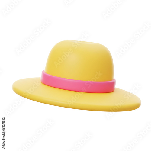 hat, yellow, sun, pink, band, accessory, headwear, clothing, fashion, style, object, item, apparel, garment, design, graphic, render, digital, illustration, art, cartoon, cute, simple, clean, modern, bright, colourful, vibrant, cheerful, happy, joyful, playful, fun, summer, warm, weather, sunny, beach, vacation, travel, holiday, leisure, relaxation, protection, rimmed, crown, smooth, trendy