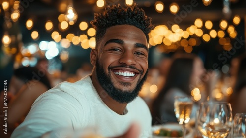 A cheerful young man at a lively gathering, surrounded by twinkling lights and happy faces, capturing the essence of friendship, joy, and celebration in a vibrant setting.