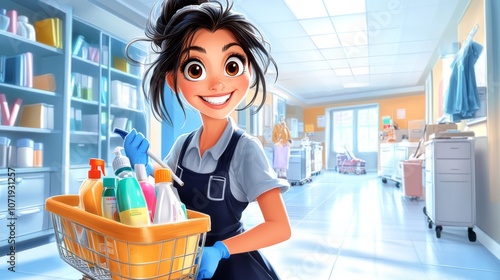 cleaning, health care, woman, cart, supply, cheerful, bright, organised, facility, smiling, men at work, occupational, routine, sterilization, safety, hygiene, colourful, young, indoor, tidy, organisation, diligence, responsibility, service, equipment, maintenance, cleanliness, professional, dedication, task, care, environment, spring cleaning, efficiency, vibrant, positivity