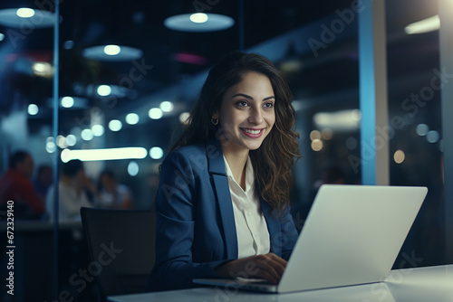 A cheerful young woman diligently typing on her laptop in a contemporary office at night, surrounded by a shimmering sea of bokeh lights. Generative AI.