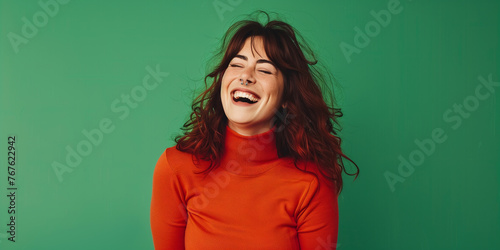 A cheerful young woman with a nose ring, wearing an orange sweater, laughing against a green background, exuding happiness and positive vibes.