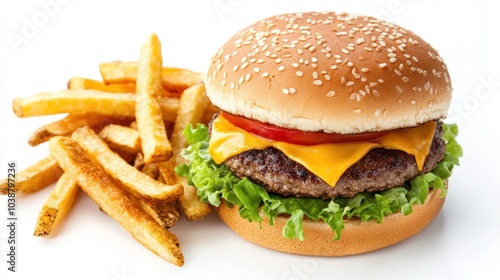 A cheeseburger with lettuce, tomato, and fries on the side, showcasing classic fast food.