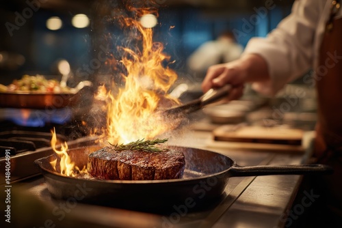 A chef expertly flames a perfectly seared steak, the fiery burst adding a dramatic flair to the culinary scene.