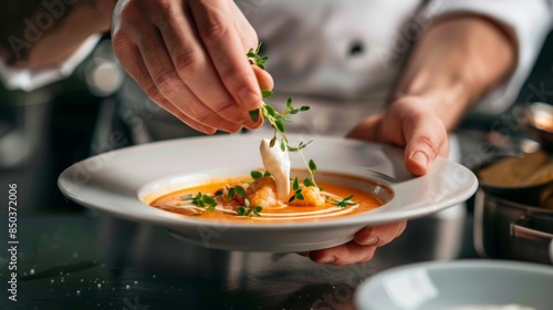 A chef garnishing a seafood bisque soup with a dollop of cream and fresh herbs in a white bowl