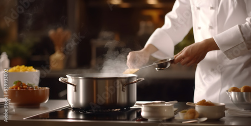 A chef in a professional kitchen prepares a meal using a steaming pot, celebrating culinary expertise on International Chefs Day
