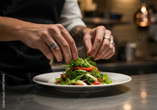 A chef meticulously places fresh greens to create a colorful and appetizing salad.