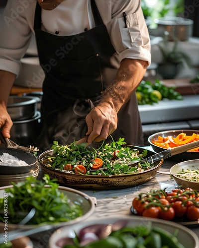 a chef preparing a salad in a kitchen