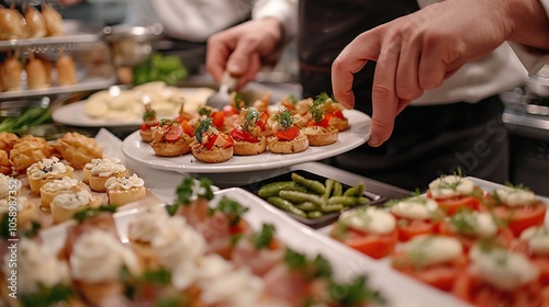 A chef's hand reaches for a plate of appetizers on a buffet table.