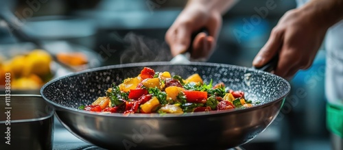 cooking, food, chef, kitchen, vegetable, red, yellow, green, pepper, onion, herb, stir fry, pan, steam, hot, meal, prepare, healthy, delicious, fresh, vibrant, dinner, lunch, tasty, organic, home, eatery, hand, ingredient, receipe, seasoning, spice, culinary, epicure, dish, kitchen utensile, tool, process, closeup, cook, favor, aromatic, healthy lifestyle, lifestyle, food preparation, home cooking, culinary arts