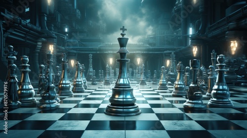 A chess game played by robots, with metallic pieces gleaming under the harsh light of a futuristic laboratory