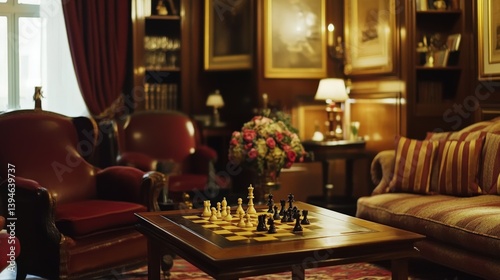 chess, chessboard, piece, game, living, room, interior, furniture, sofa, armchair, red, wood, table, lamp, flower, arrangement, home, comfort, elegant, classic, cosy, luxury, decor, brown, stripes, cushion, traditional, ornate, light, shadow, wall, painting, art, sharpened, strategic, competition, thinking, strategy, leisure, recreation, pastime, detail, perspective, composition, setting, ambience, rich, warm